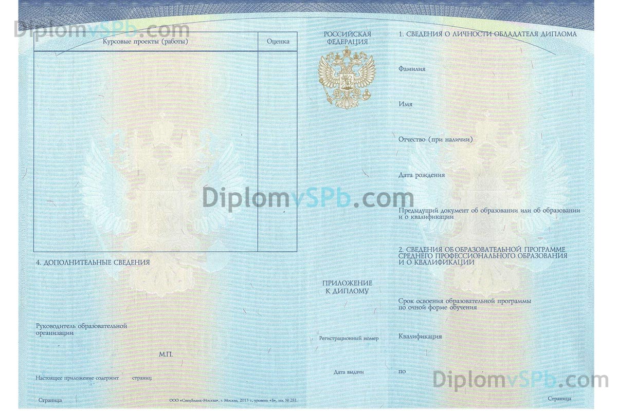 Диплом, изготовленный нашей компанией, ничем не отличается от тех, кто выдают в училищах и лицеях России, имеет все степени защиты, заполняется по государственным стандартам, заверяется печатью учебного заведения и содержит следующие сведения: